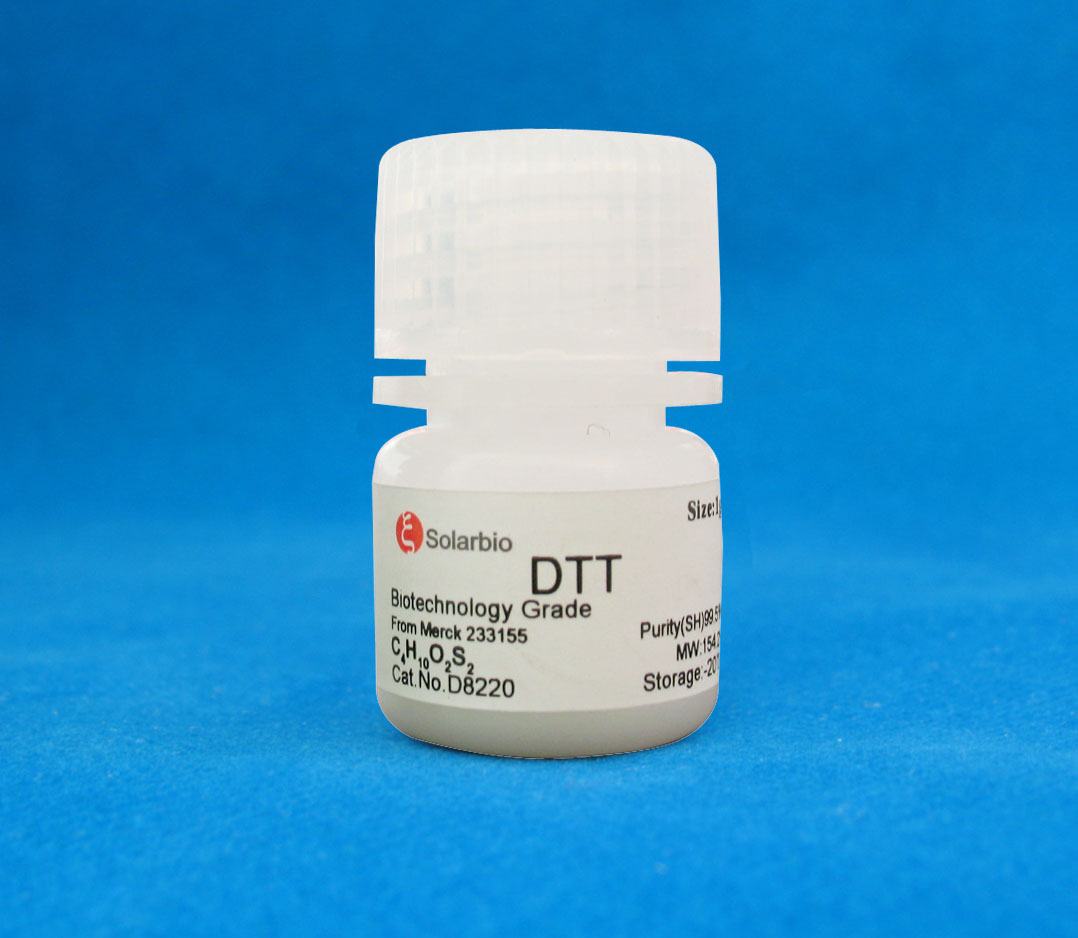 溶解性:用20ml 0.01mol/l乙酸钠溶液(pH5.2)溶解3.09gDTT,过滤除菌,每管分装1ml,于-20℃贮存。